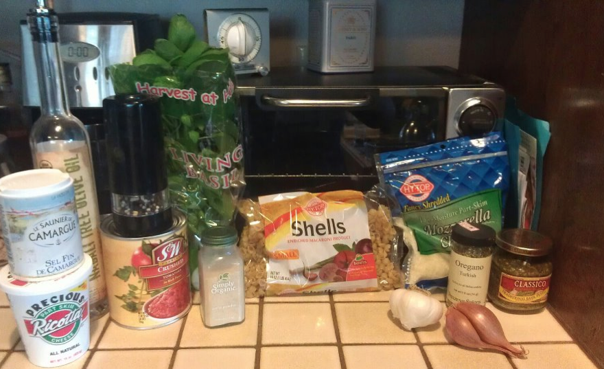 If you like cheese, basil, or cheese than you NEED to try this recipe. Every note to this dish simply sings. You have the pasta shells coated in pesto and creamy ricotta cheese, topped with a homemade tomato sauce full of fresh basil; the dish is completed with a “healthy” topping of baked mozzarella. Oh did I mention that you can start eating this dish in about 30 minutes. Feel free to add chicken strips to this recipe.