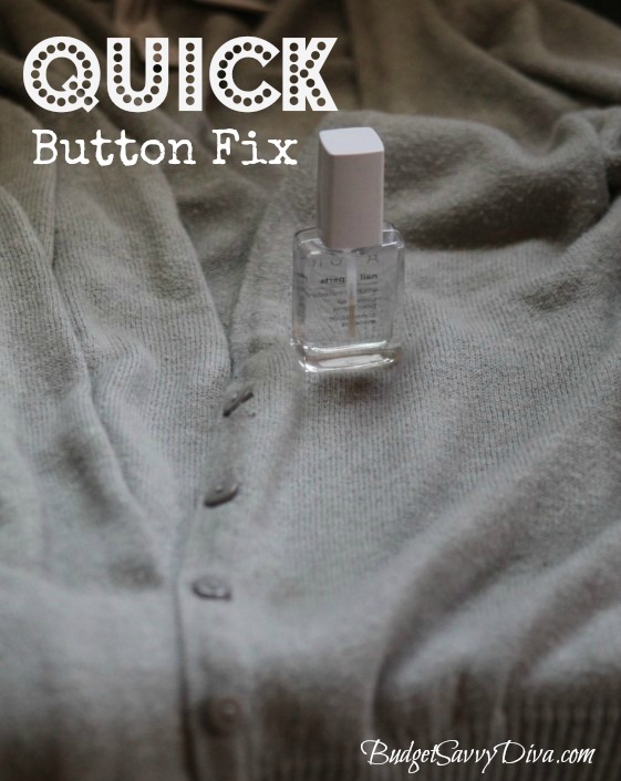 If you have a button that is hanging on by a thread, literally, but you don’t have a sewing kit, try a dab of clear nail polish to keep in in place until you can get it fixed!