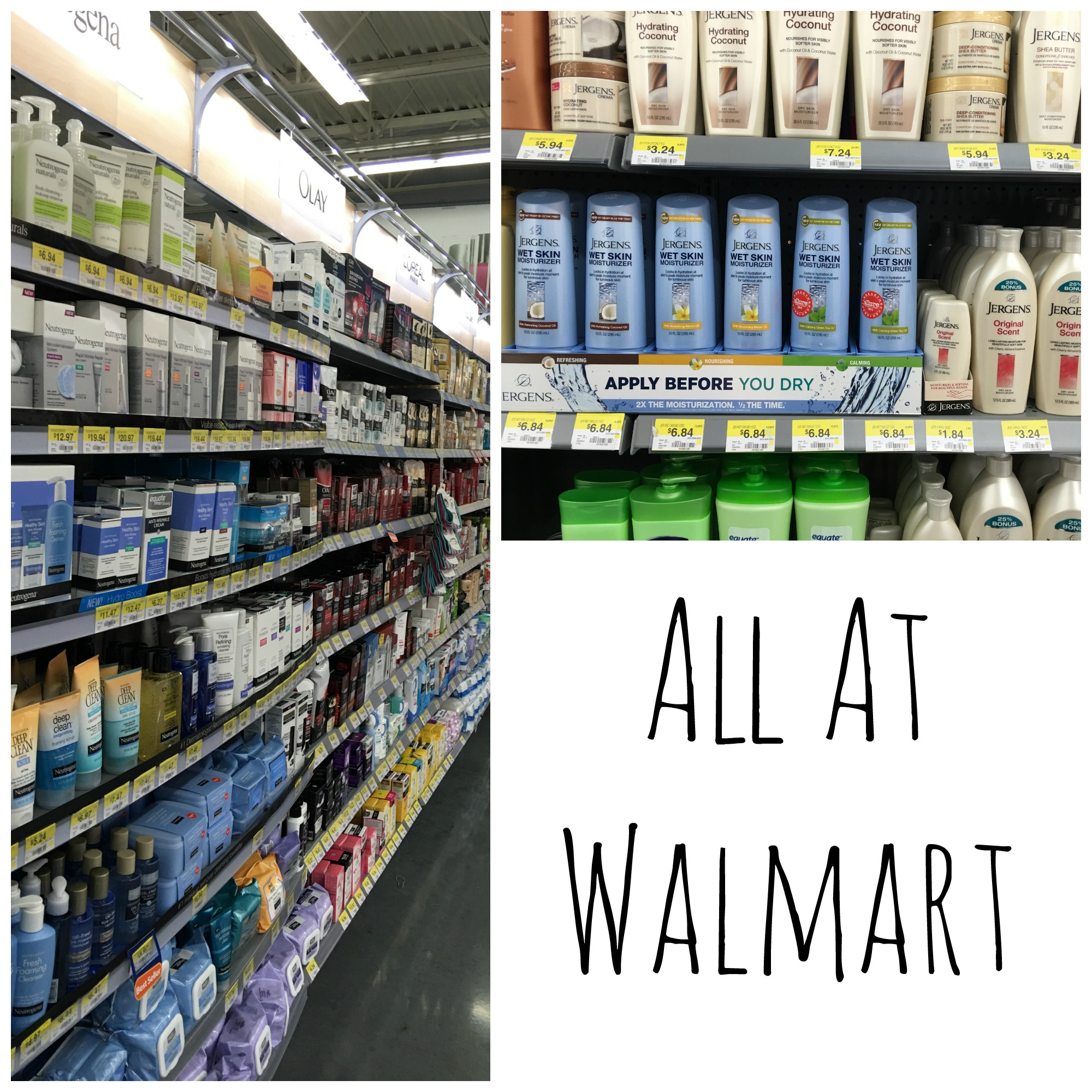 I went to Walmart ( very easy to find the product) to pick up some Jergens Wet Skin Moisturizer