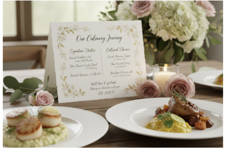 Instead of a generic menu, design one that reflects your personality, culture, or journey. Couples can include favorite dishes they enjoyed on dates, while corporate events can highlight foods tied to the company’s roots.