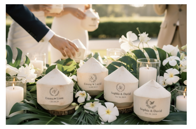 If you want something truly unique, branded coconuts are a trend that stands out. They can be personalized with names, wedding dates, or even logos for corporate events.